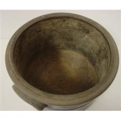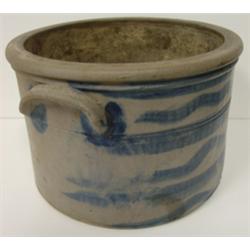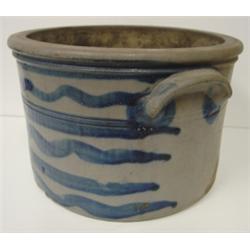 BLUE DECORATED STONEWARE CROCK WITH EARS. Interesting blue line decoration on front of body. Slight roughness to bottom edge of base. Good overall condition. 7" H