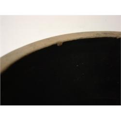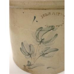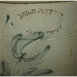BLUE DECORATED STONEWARE CROCK WITH EARED HANDLES. Stamped on front "Union Pottery". Blue floral decoration on body. One hairline crack running from top of body measuring 3.5" L. One small chip on inside edge of top rim. 7.25" H, 8" Dia.