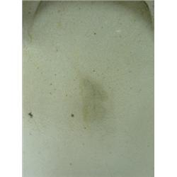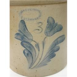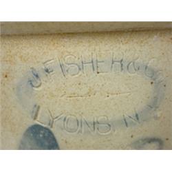 BLUE DECORATED STONEWARE CROCK WITH EARED HANDLES. 3 gallon. Stamped on body "J. Fisher & Co.-Lyons, NY". Blue floral decoration with "3" on body. "Y" shaped hairline crack under eared handle measuring 6.25" L. 10.25" H, 10.5" Dia.