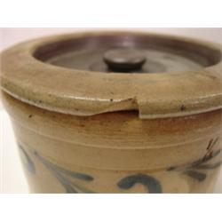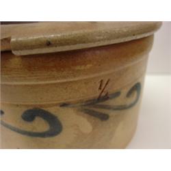 BLUE DECORATED STONEWARE CROCK WITH LID. 1/2 gallon. Blue touch arrow decoration around body. One chip on outer edge of lid. 5" H, 7.5" Dia.