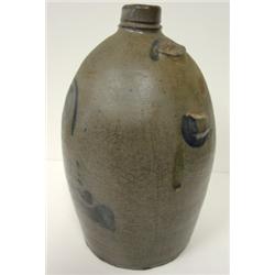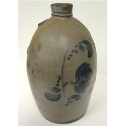 BLUE DECORATED STONEWARE JUG. Missing handle. Heavy blue floral decoration on body. 11.75" H