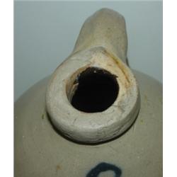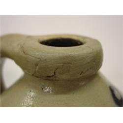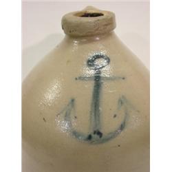 BLUE DECORATED HANDLED STONEWARE JUG. Blue decorated anchor design on front of body. Has been professional repaired at top. Good overall condition. 11" H