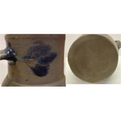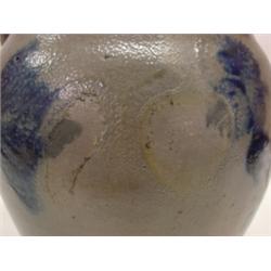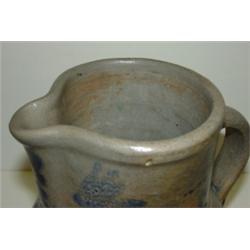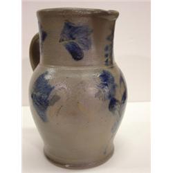 BLUE DECORATED STONEWARE PITCHER. 1 gallon. Blue floral decoration throughout body. Shows loss to glaze in two spots on body. 9" H, 4.75" Dia.