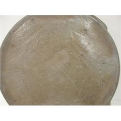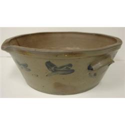 BLUE DECORATED MILK BOWL WITH SPOUT & EARS. 1.5 gallon. Embossed 1 1/2 on body. Has hairline crack extending from top of base to middle of bottom measuring. 4.75" H, 13" Dia.