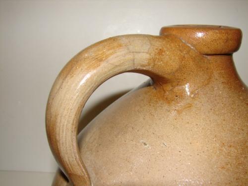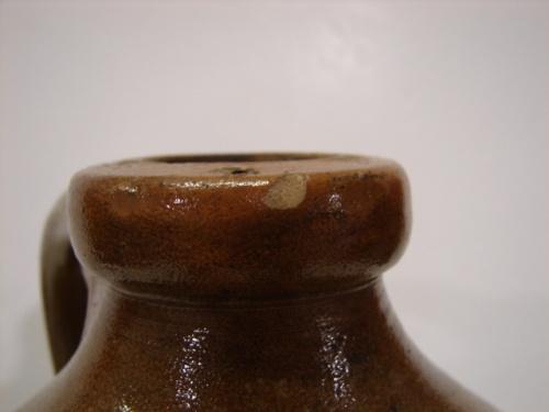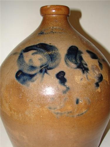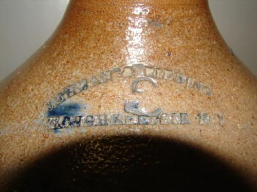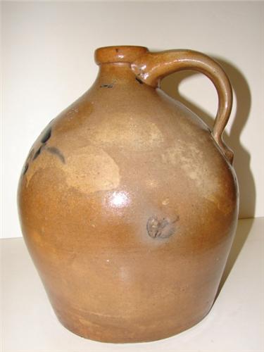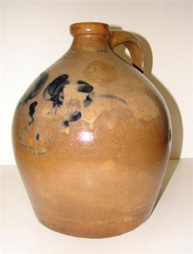 BLUE DECORATED NEW YORK OVIOD STONEWARE JUG. Cobalt blue brush decorated design at front. Marked “Lehman & Rieding/Poughkeepsie, NY” above blue decoration. Shows two small chips at spout. Handle shows some tight hairline cracks. 12.5” H