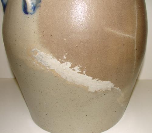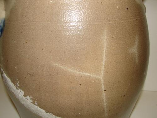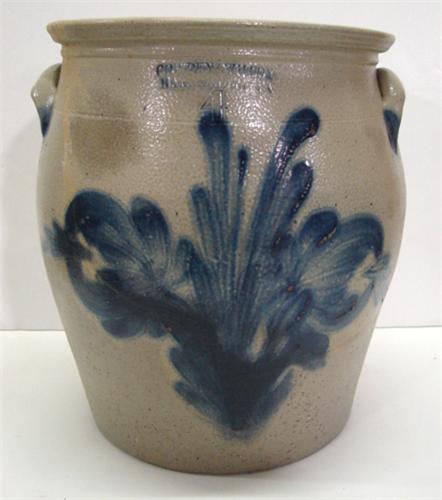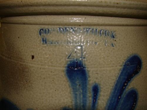 BLUE DECORATED PENNSYLVANIA STONEWARE CROCK. 4 gallon. Has eared handles. Stamped near top “Cowden & Wilcox/Harrisburg, Pa./4”. Cobalt blue brush decorated floral design on body. Crock shows repair to one vertical crack at front of body and one diagonal crack at reverse. Shows some tight hairline spider cracks. 13” H