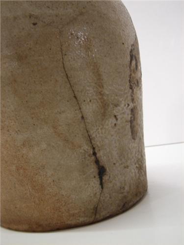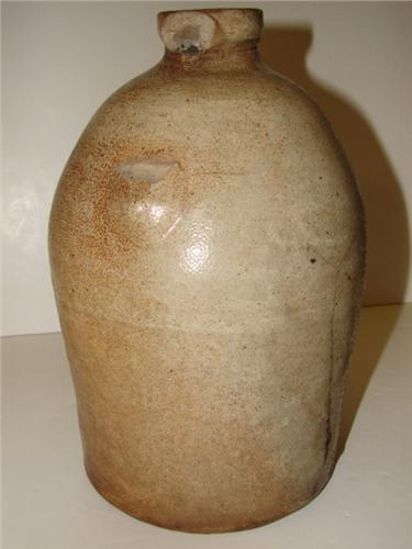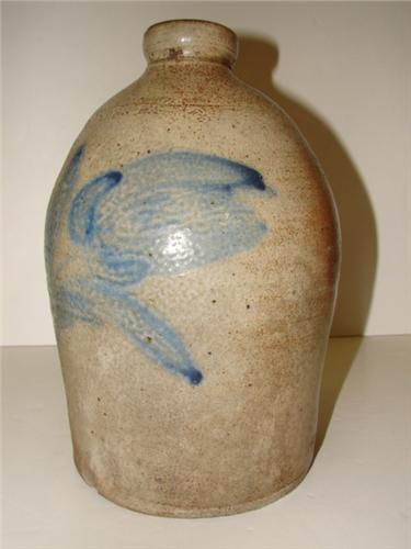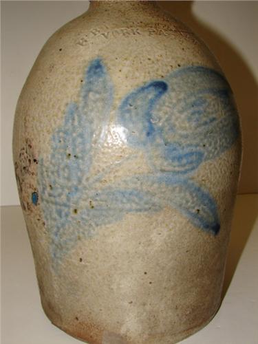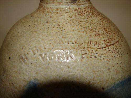 BLUE DECORATED PFALTZGRAFF STONEWARE JUG. Missing handle. Cobalt blue brush decorated tulip design at front. Marked “H.B. Pfaltzgraff/York, PA” above blue decoration. Shows one small chip at spout. Shows one vertical hairline crack on body running through base. Shows one small chip at bottom of body near base. 10.5” H