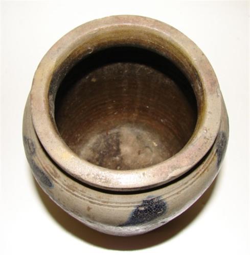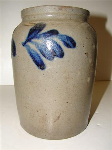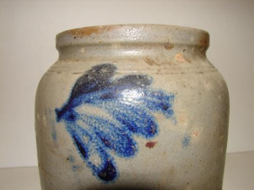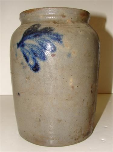 BLUE DECORATED STONEWARE CANNING CROCK. 1 quart. Decorated with cobalt blue brush decorated leaves at top. 7” H