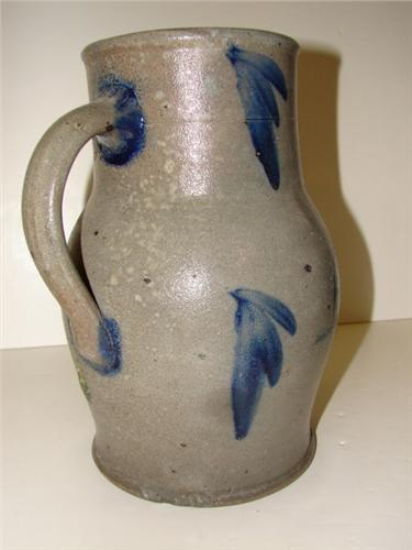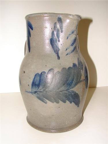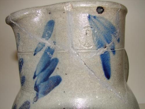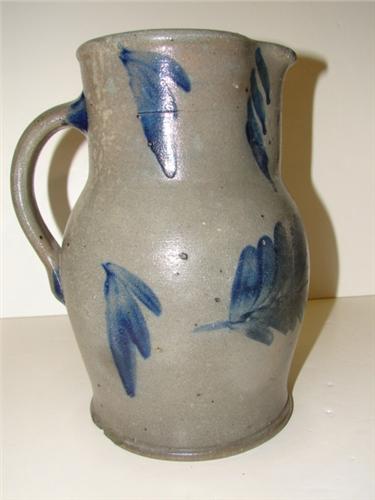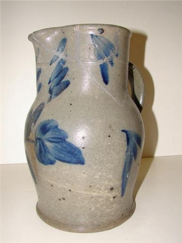 BLUE DECORATED STONEWARE CROCK PITCHER WITH HANDLE. 1 gallon. Elaborate cobalt blue brush decorated floral design on body. Three pieces on top of pitcher have been repaired. Incised “1” at top. Shows one chip at edge of bottom. 10.5” H