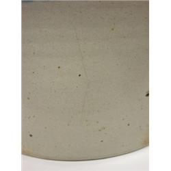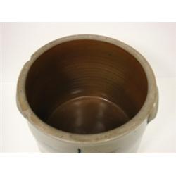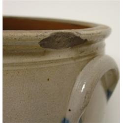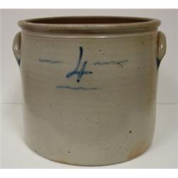 Blue decorated stoneware No. 4 stoneware crock with ears. Has blue flower decoration on body and blue No. 4 on back. Has one 1.5" chip on outer rim. Has one hairline crack on back visible from the outside measuring approx. 3.5". 10.5" H, 11" Dia.
