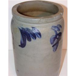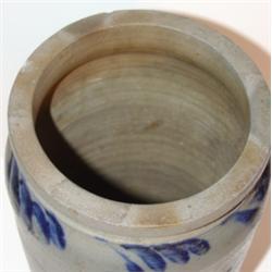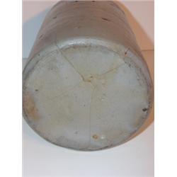 Blue decorated stoneware crock. Has spider surface cracks on bottom. Small chip on top of rim. 10" H