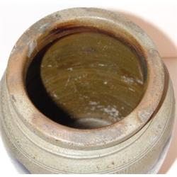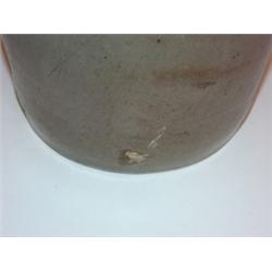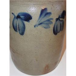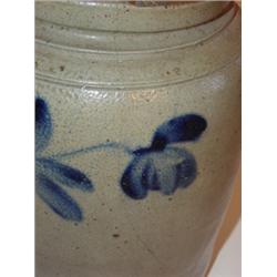 Blue decorated stoneware crock. Has been professionally repaired on one side. Several small chips on outer rim. 10" H