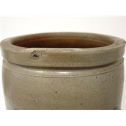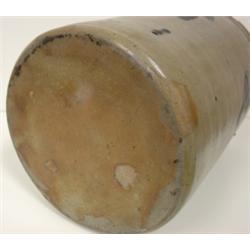 BLUE DECORATED STONEWARE CROCK. 2 gallon. Marked "2" on body. Blue floral decoration on body. Has hairline running from top measuring 3.5" and another hairline measuring 8". 12" H