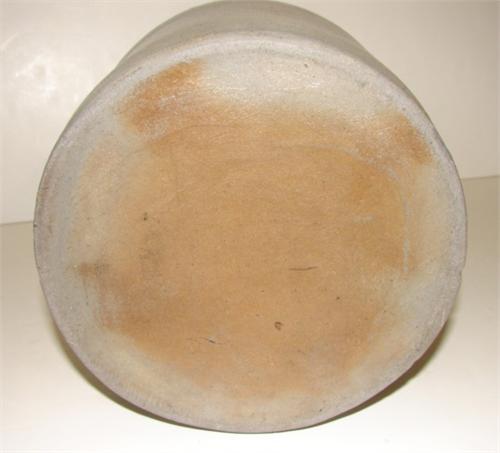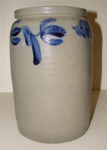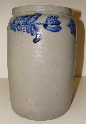 BLUE DECORATED STONEWARE CROCK. Cobalt blue brush decorated tulip design around top of body. Shows one chip at top inner portion of rim. Shows one chip at bottom of body along edge. 10.25” H