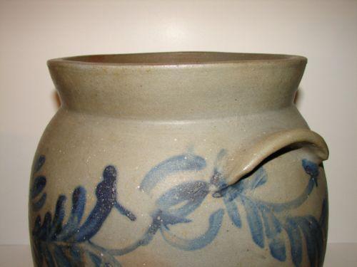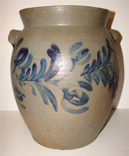 COBALT BLUE DECORATED OVOID STONEWARE CROCK. Eared handles. Elaborate cobalt blue brush decorated floral design around body. 13” H