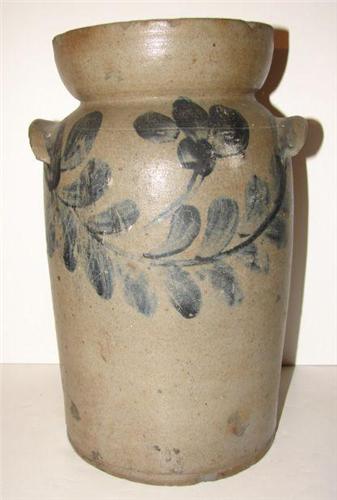 COBALT BLUE DECORATED STONEWARE CROCK. 1.5 gallon. Eared handles. Cobalt blue brush decorated floral & vine decoration around body. Stamped at top of body “H. Myers”. Shows some loss to blue decoration. Shows some chipping around top rim and at bottom of body. 12.5” H