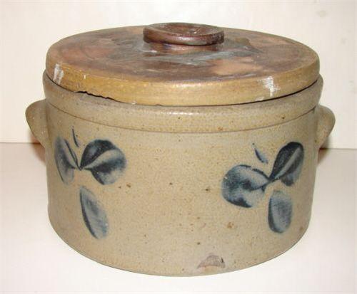 SMALL COBALT BLUE DECORATED STONEWARE CAKE CROCK WITH LID. Eared handles. Cobalt blue brush decorated clover motif around body. Shows one small chip at bottom of base. Shows one tight vertical hairline crack. Lid has cobalt blue brush decorated feather motif at top. Lid shows chipping at bottom and tight hairline cracks throughout. 5” H, 7.5” Dia.