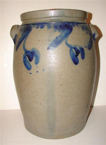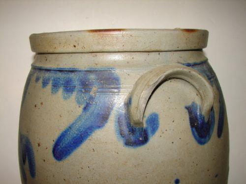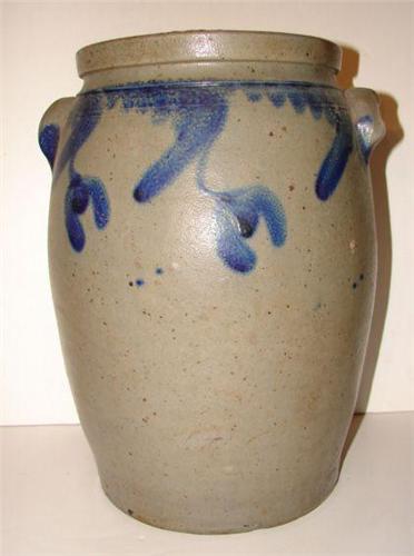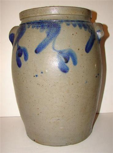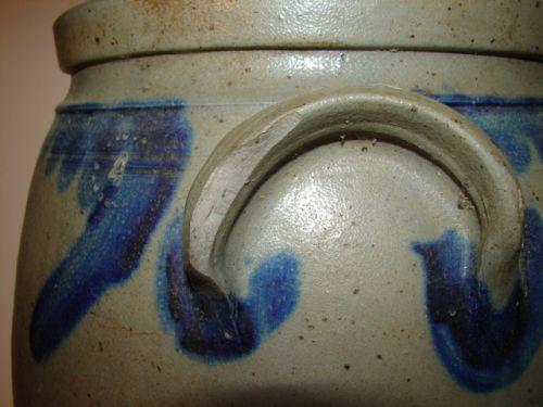 COBALT BLUE DECORATED OVOID STONEWARE CROCK. 4 gallons. Eared handles. Cobalt blue tulip motif around top of body. Double incised line decoration around top of body. Stamped “4” at top of body. Shows chip at one handle. Shows minor chipping at bottom edge of base with minor crack. 15” H