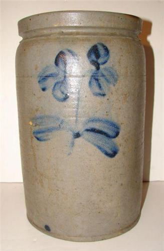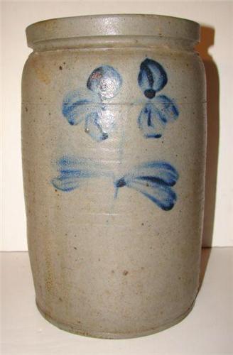 COBALT BLUE DECORATED STONEWARE CROCK. 2 gallons. Cobalt blue brush decorated double flower design at 3 areas on body. Incised line decoration at top and bottom of body. Stamped “2” at top of body. Shows one chip at top rim. 13” H