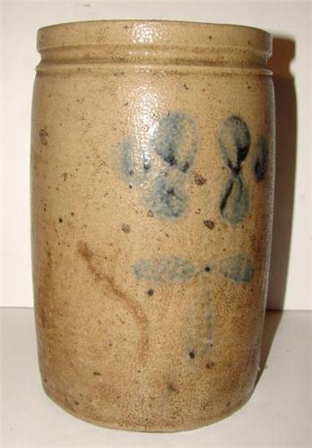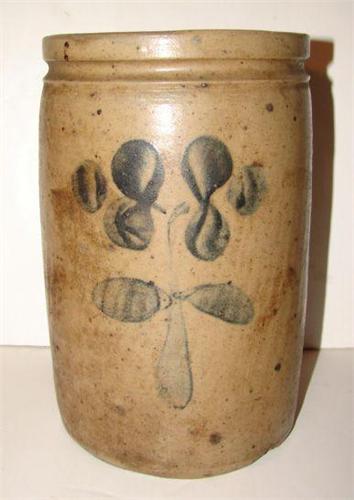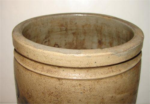 COBALT BLUE DECORATED STONEWARE CROCK. Cobalt blue brush decorated double flower design at 2 areas on body. Shows one large chip at edge of base. 9.75” H