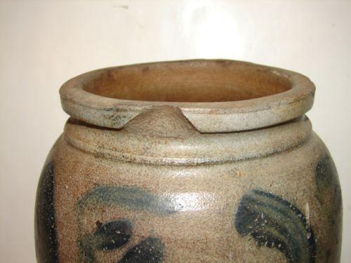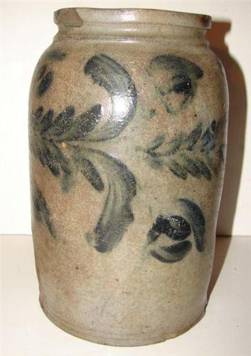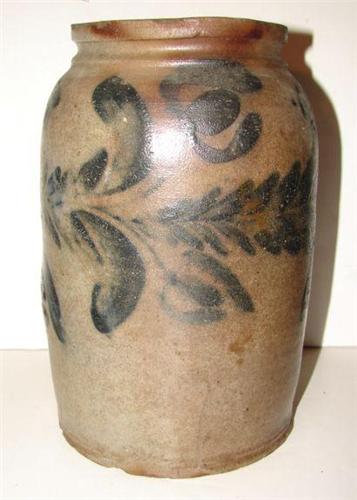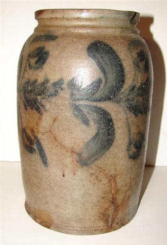 COBALT BLUE DECORATED STONEWARE CROCK. 1 gallon. Cobalt blue brush decorated floral motif around body. Double incised line decoration at bottom of body. Stamped “1” near top of body. Shows chipping at top rim and at edge of base. Shows one tight vertical hairline crack running through base. 10” H