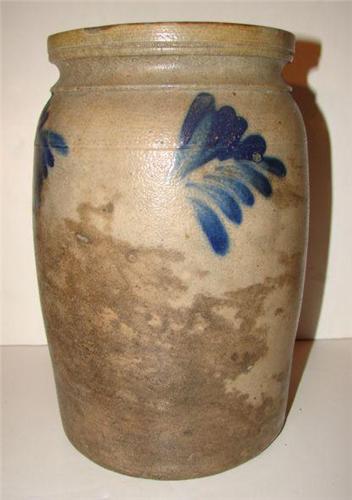 COBALT BLUE DECORATED STONEWARE CROCK. Cobalt blue brush decorated leaf design at 4 areas on body. Incised line decoration at top of body. Shows one minor chip at interior of top rim. Shows one chip at edge of base. Shows discoloration. 10.5” H