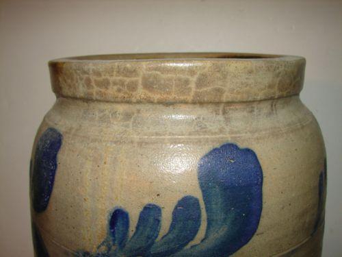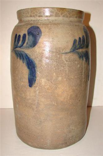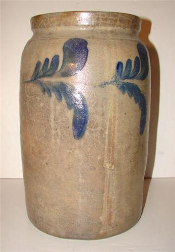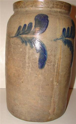 COBALT BLUE DECORATED STONEWARE CROCK. Cobalt blue brush decorated feather motif around top of body. Incised line decoration around top of body. Shows crazing throughout. 13.5” H