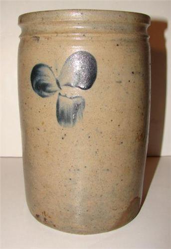 COBALT BLUE DECORATED STONEWARE CROCK. Cobalt blue brush decorated clover design at 3 areas on body. Shows one chip at inner portion of top rim. 8.625” H