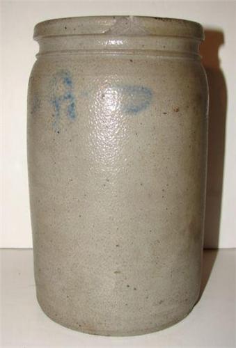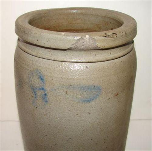 COBALT BLUE DECORATED STONEWARE CROCK. Cobalt blue brush decorated leaf design at 3 areas on body. Shows one chip at outer portion of top rim. 8.625” H