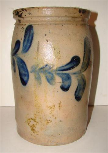 COBALT BLUE DECORATED STONEWARE CROCK. Cobalt blue brush decorated leaf motif around body. Shows one chip along outer portion of top rim and three chips along inner portion of top rim. Shows one tight vertical hairline crack running from top rim to body. Shows tight spider cracking at bottom of body near base. 10.5” H