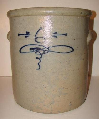 COBALT BLUE DECORATED STONEWARE CROCK. 6 gallons. Eared handles. Cobalt blue slip decorated “6” on body over a slip decorated design. Incised line decoration around top of body. Shows two tight vertical hairline cracks at top rim. 13.375” H