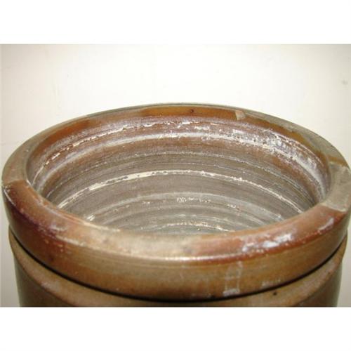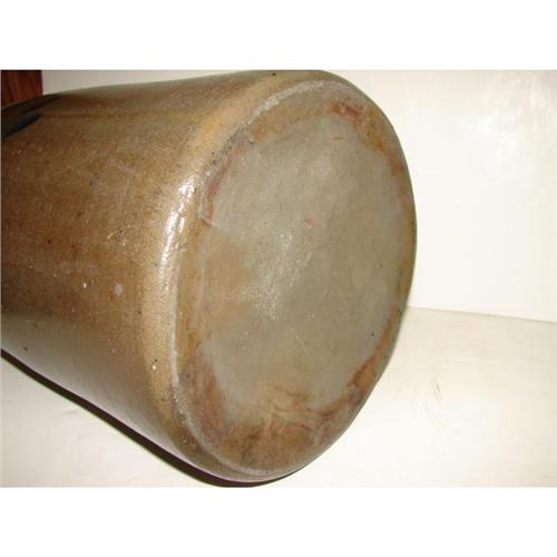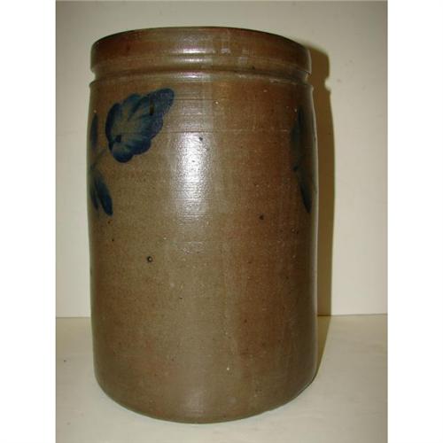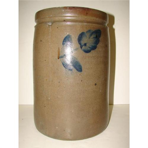 BLUE DECORATED STONEWARE CROCK. 2 gallons. Cobalt blue brush decorated floral design at three areas around top of body. Stamped “2” at top. Shows one small chip at inner portion of top rim. 12.25” H