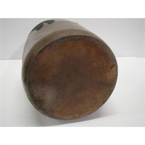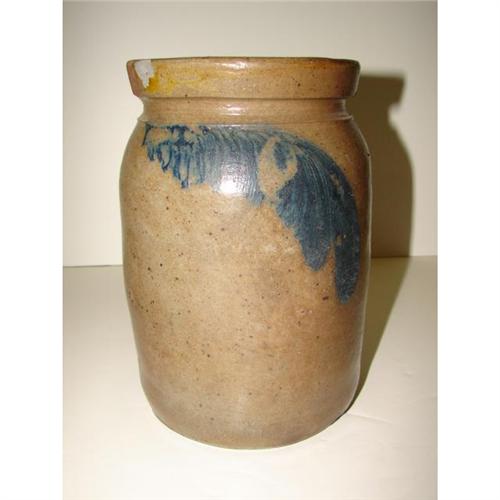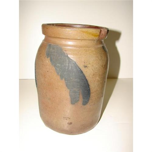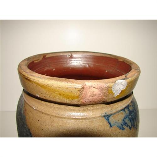 BLUE DECORATED STONEWARE JAR. 8” high. Some glaze fry, two large chips to rim.