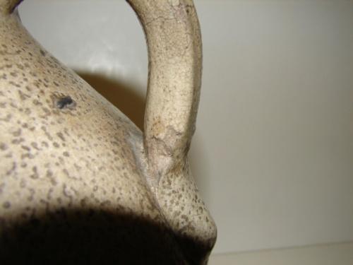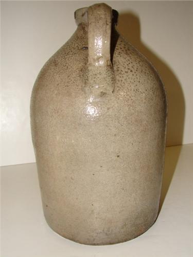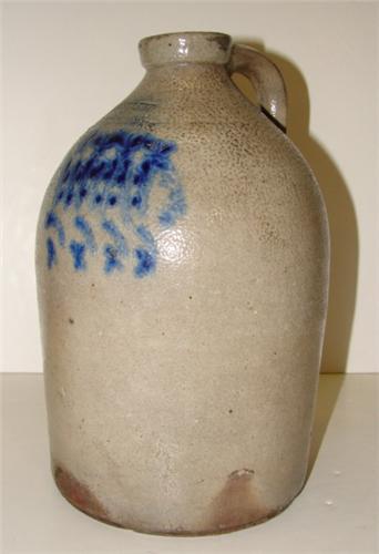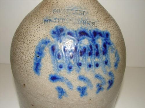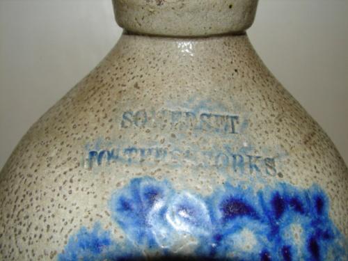 BLUE DECORATED STONEWARE JUG. Cobalt blue slip decorated design at front. Marked “Somerset/Potters Works” above blue decoration. Shows a few small chips at spout. Shows small chips along bottom of body. Handle shows signs of crazing and one small chip at bottom. 12” H