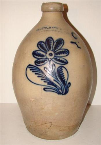 COBALT BLUE DECORATED STONEWARE JUG. Cobalt blue slip decorated floral design on body. Stamped “N. Clark & Co./Rochester, N.Y.” near spout. Jug shows major cracking and repair. 15” H