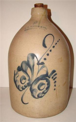 COBALT BLUE DECORATED STONEWARE JUG. 2 gallons. Cobalt blue slip decorated floral design at body. Stamp above blue decoration “F.B. Norton & Co./Worcester, Mass.” Shows some minor chipping around spout. Shows one tight hairline crack at bottom of handle. 13.5” H