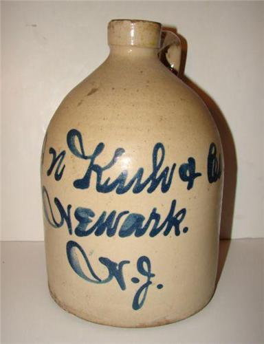 COBALT BLUE DECORATED STONEWARE JUG. Cobalt blue slip decorated text at body reads “J N Kuh & Co./Newark/N.J.” Shows crazing throughout. Shows chipping at spout. Shows one tight crack at handle. 10.75” H