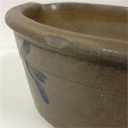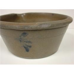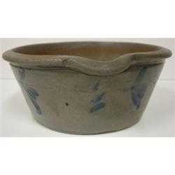 Blue decorated stoneware milk bowl with spout. Has three chips along top rim. 4" H, 8.5" Dia.
