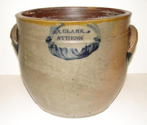 BLUE DECORATED STONEWARE OVOID CROCK. Stamped near top of body “N. Clark/Athens”. Has eared handles and cobalt blue brush decoration around text on body. Crock shows several small tight hairline cracks throughout body and at base. Crock shows one chip on inner portion of top rim. 9.75” H, 11.75” Dia.