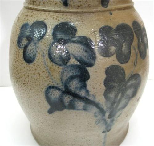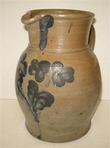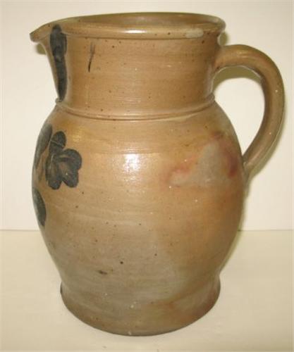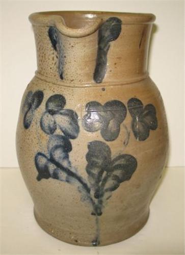 BLUE DECORATED STONEWARE PITCHER. 1.5 gal. Cobalt blue brush decorated with floral design at front. Excellent condition with no chips or cracks. 11.5” H