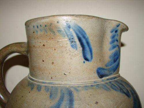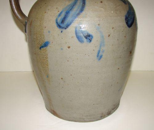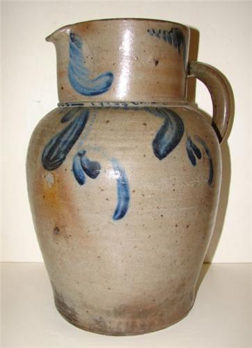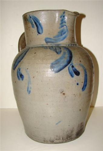 COBALT BLUE DECORATED VIRGINIA STONEWARE PITCHER. 3 gallon. Cobalt blue feather motif around top of body. Stamped "3" at top of body. Excellent condition. 14.75" H