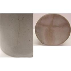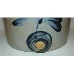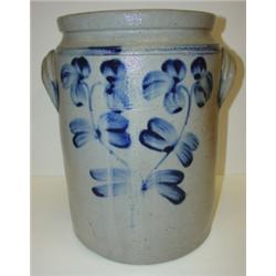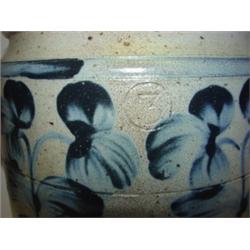 BLUE DECORATED STONEWARE WATER CROCK with splendid blue floral decoration and eared handles. 3 gallon. Embossed "3" on top of front. Blue decoration on front and reverse as well as on sides near eared handles. Slight hairline crack on bottom running upward to side. 13.25" H