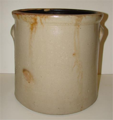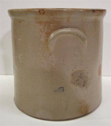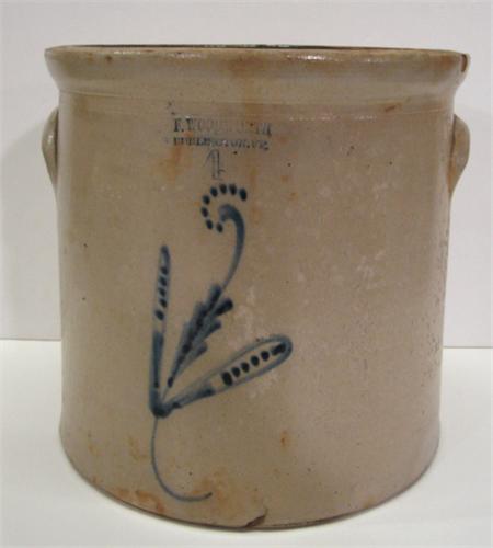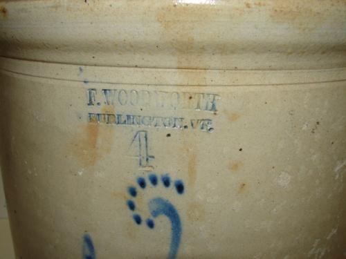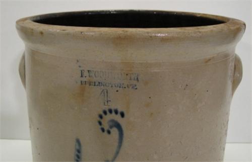 BLUE DECORATED VERMONT STONEWARE CROCK. 4 gallon. Has eared handles. Stamped near top of body “F. Woodworth/Burlington, VT./4”. Cobalt blue slip decorated floral design on body. Shows a series of small chips along inner and outer portion of top rim. Shows one crack along bottom edge. Shows loss to glaze throughout. 11.25” H