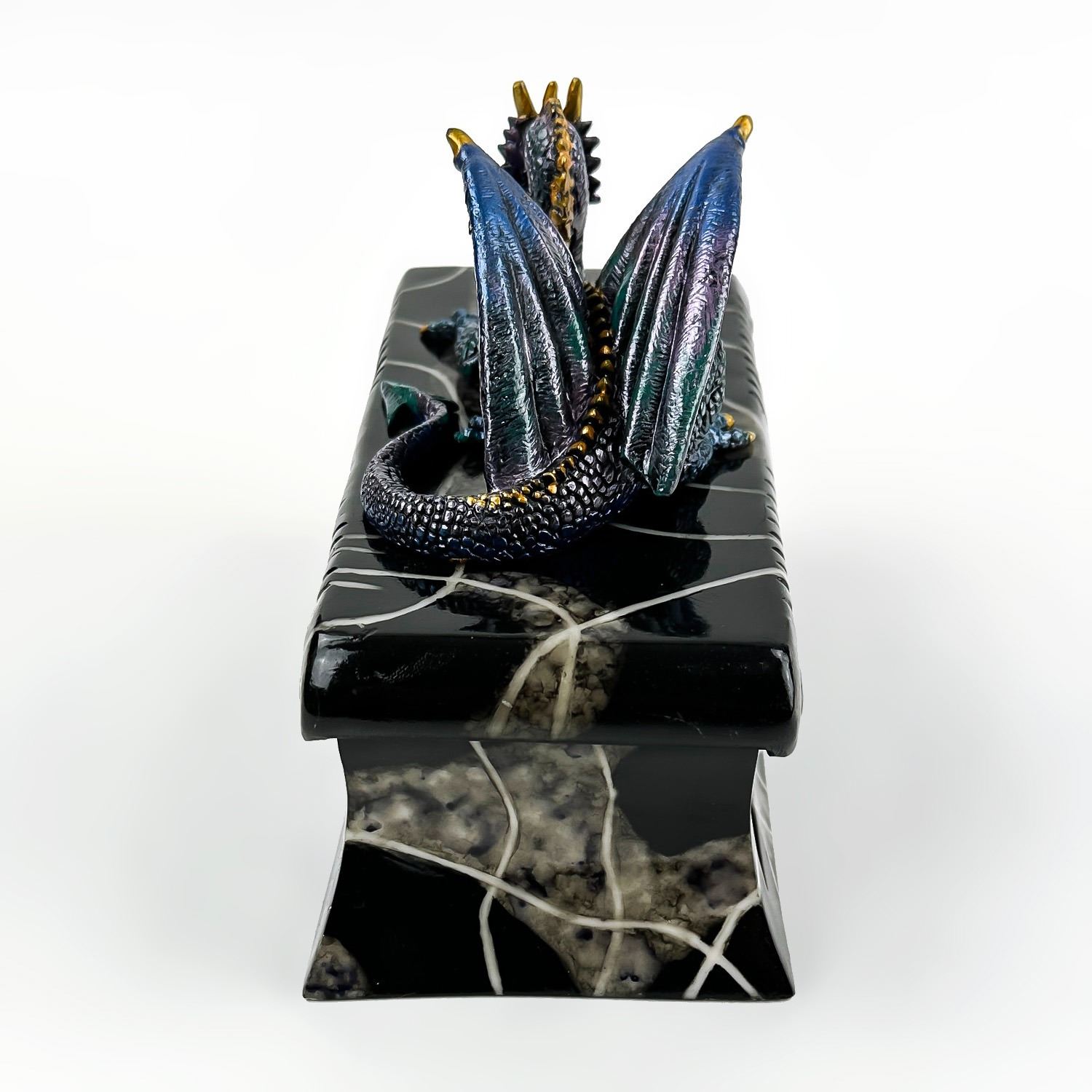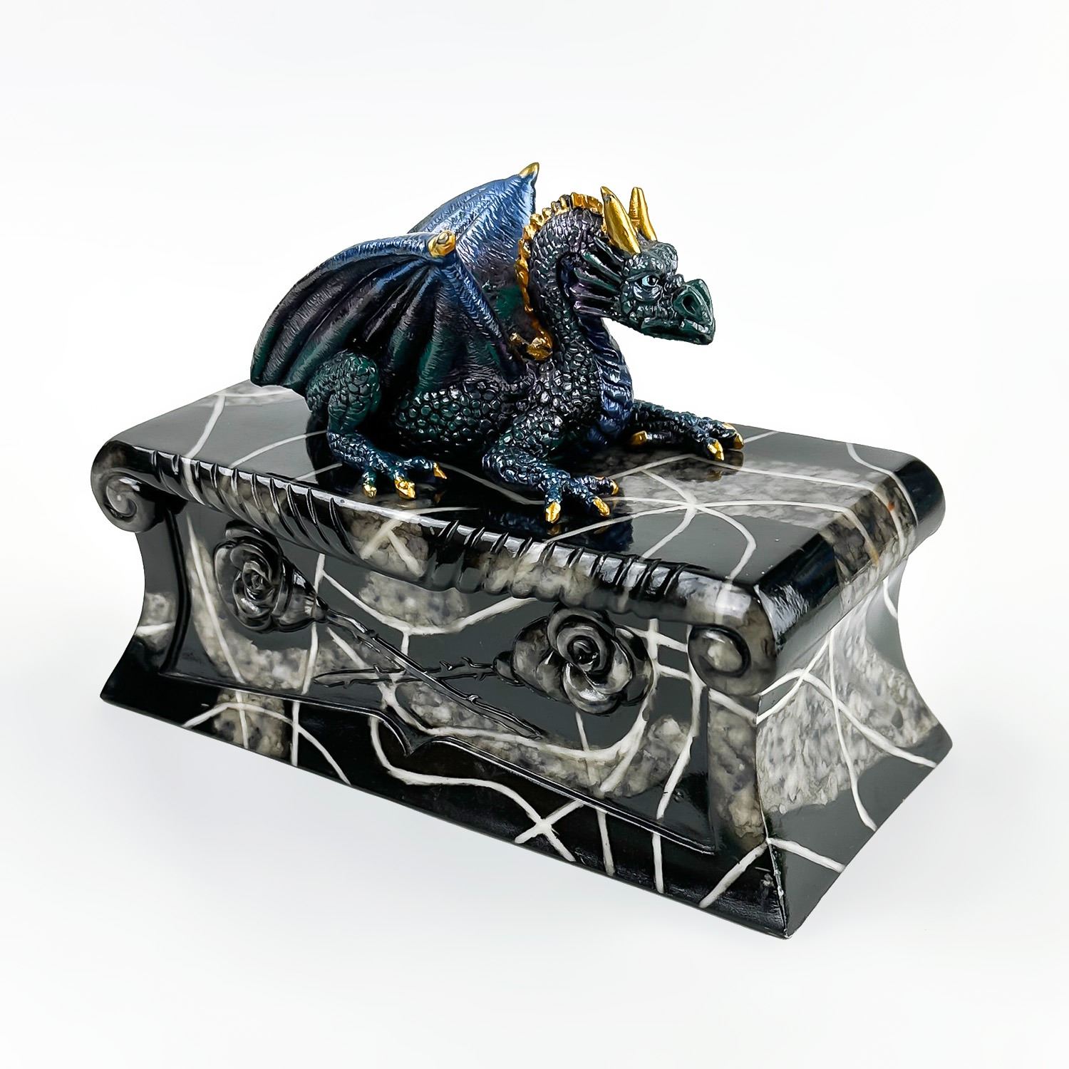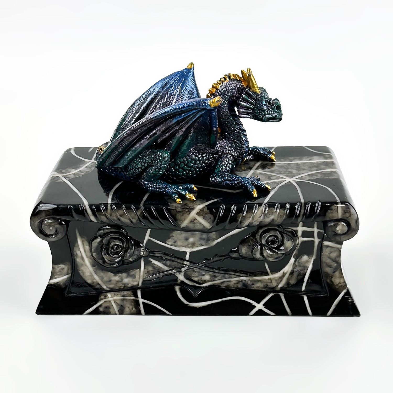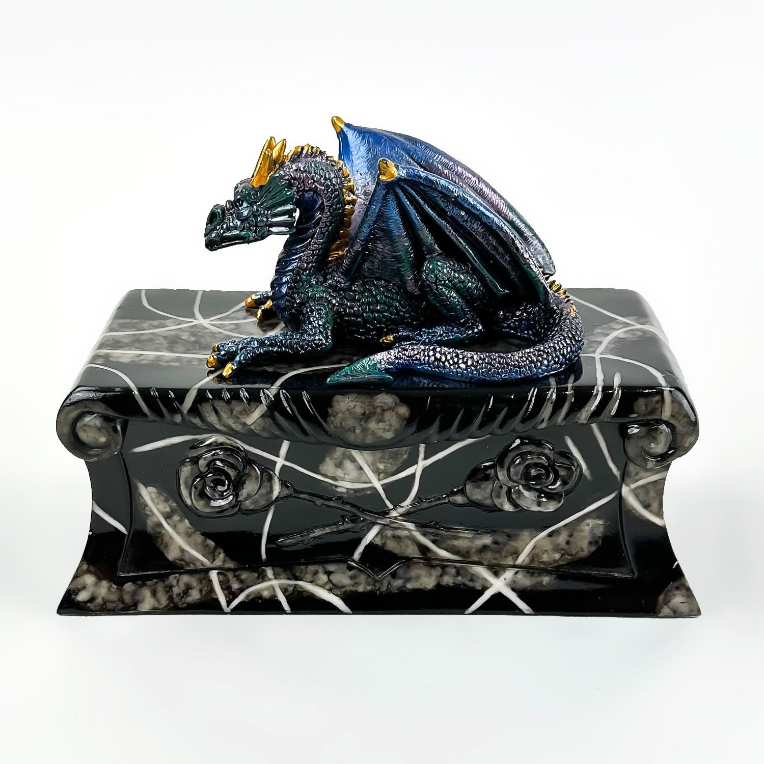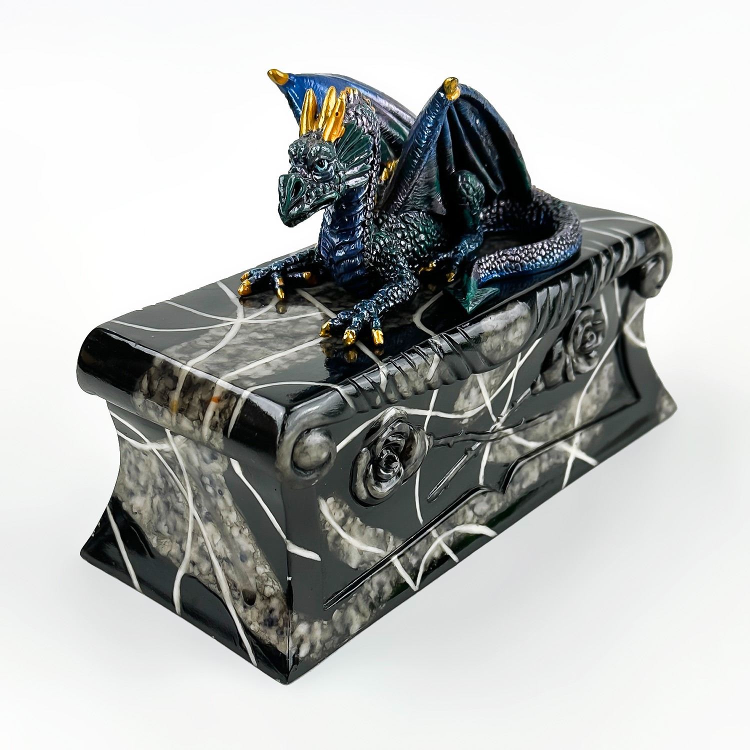 #8228 - COLLECTIBLE MULTI-COLOR BLUE DRAGON ON A COFFIN SCULPTURE. THIS LIDDED TRINKET OR JEWELRY BOX IS MADE OF A RESIN TYPE OF MATERIAL. THE DRAGON SITS UPON THE LID OF A FAUX MARBLE LOOKING BLACK ROSE COFFIN CASKET CRYPT. NO CRACKS, CHIPS OR REPAIRS. MEASURES 7.5” (19 CM) LONG BY 3.5” (9 CM) DEEP AND STANDS 5.25” (13.5 CM) HIGH - BASE TO TOP OF DRAGON HEAD.
