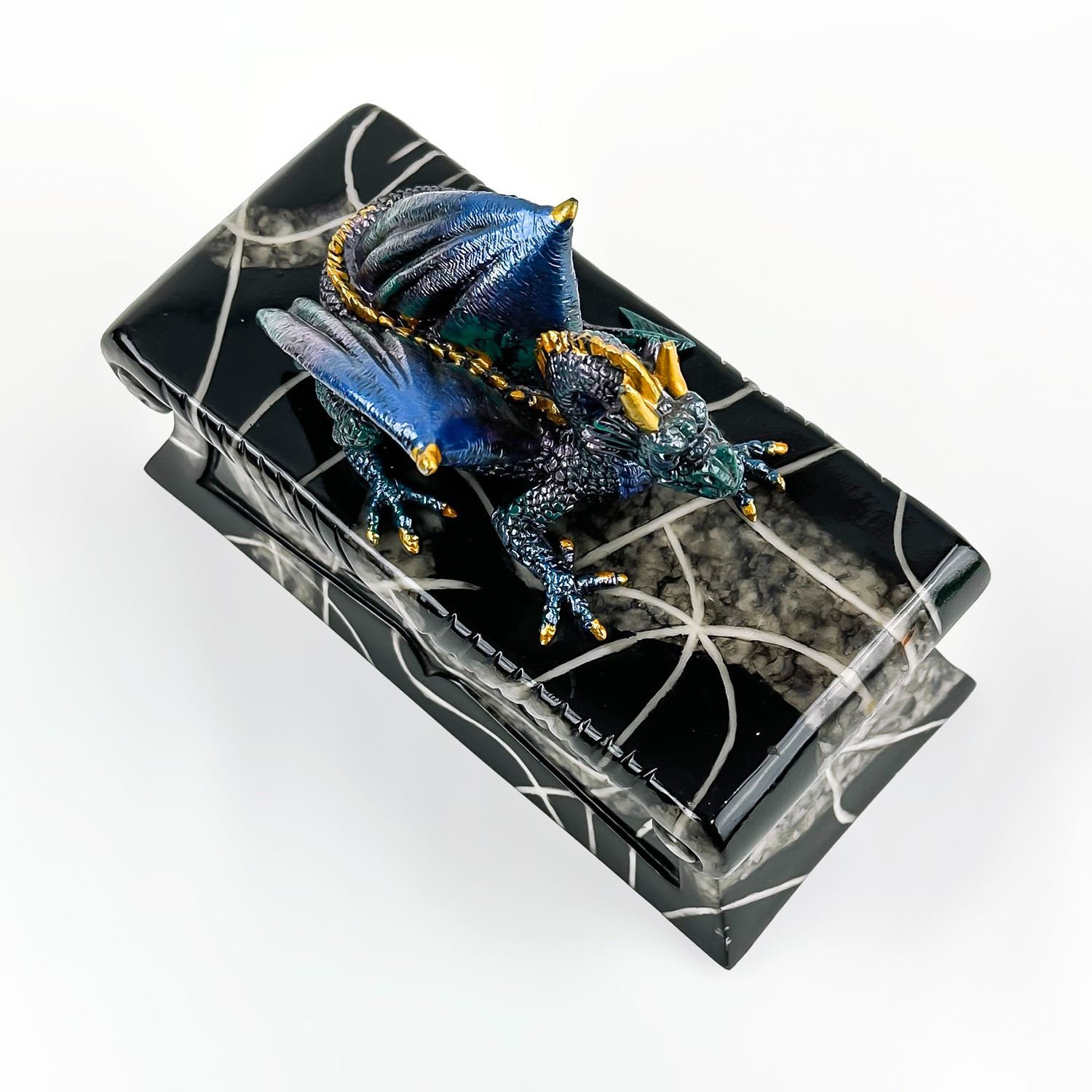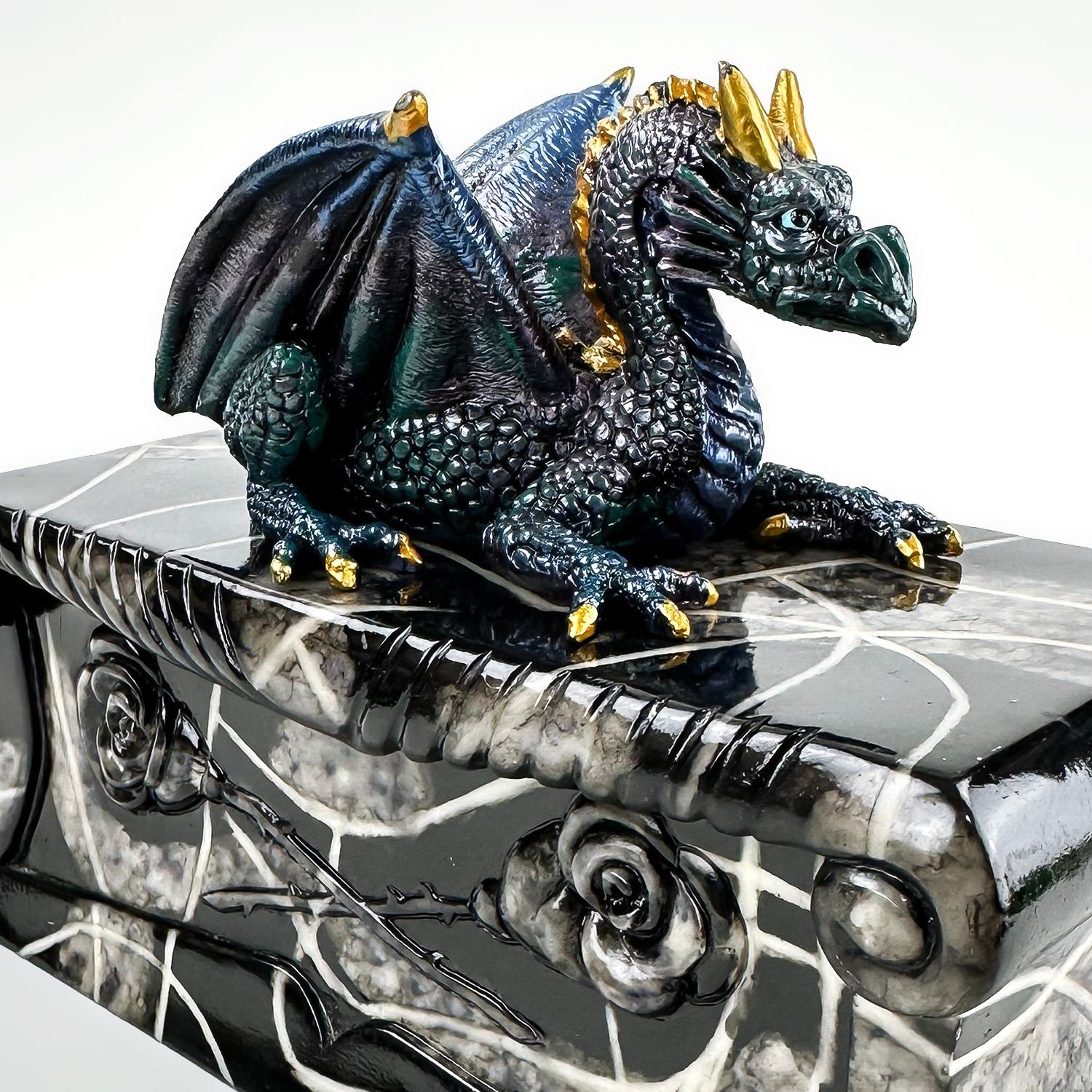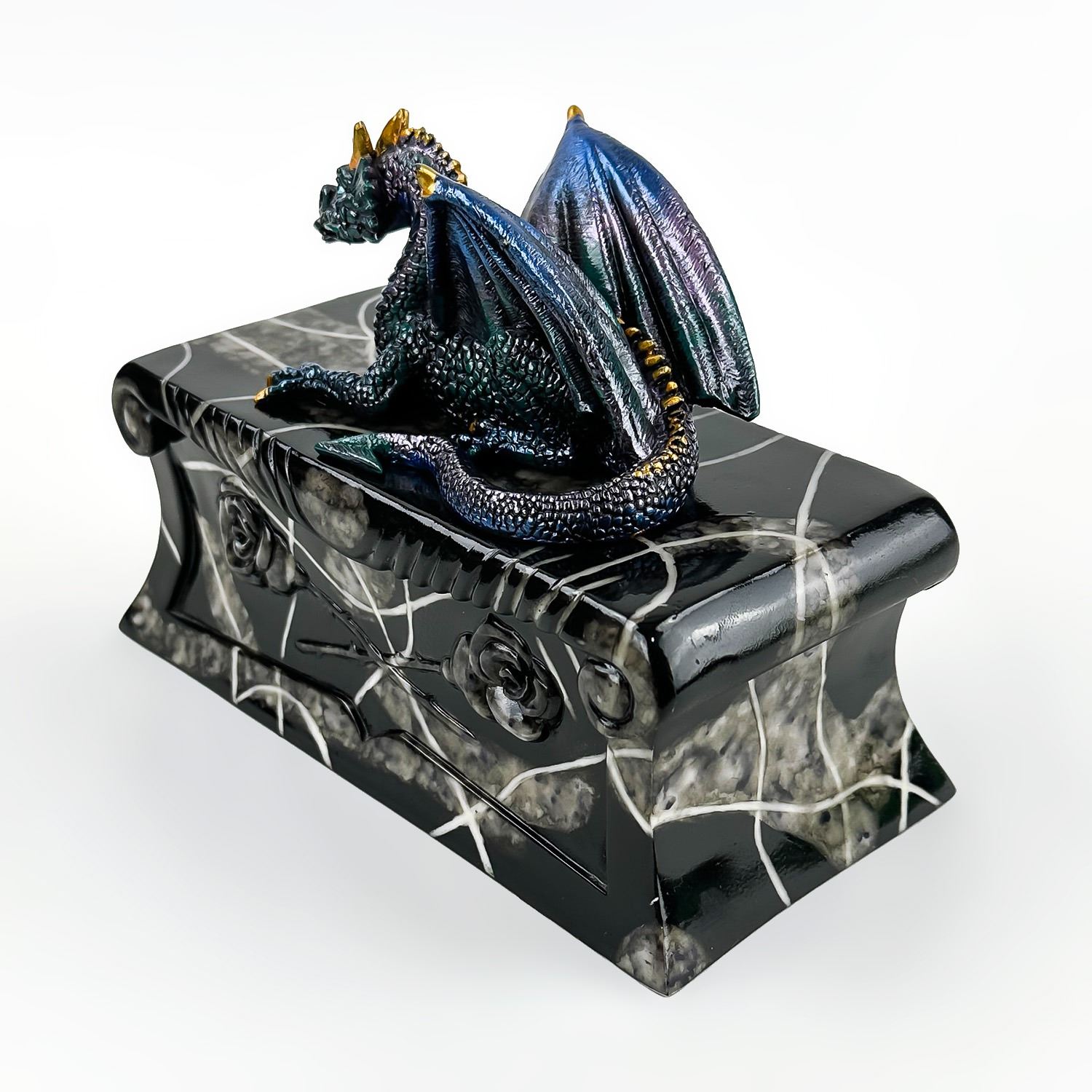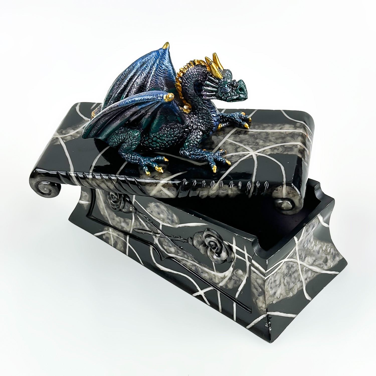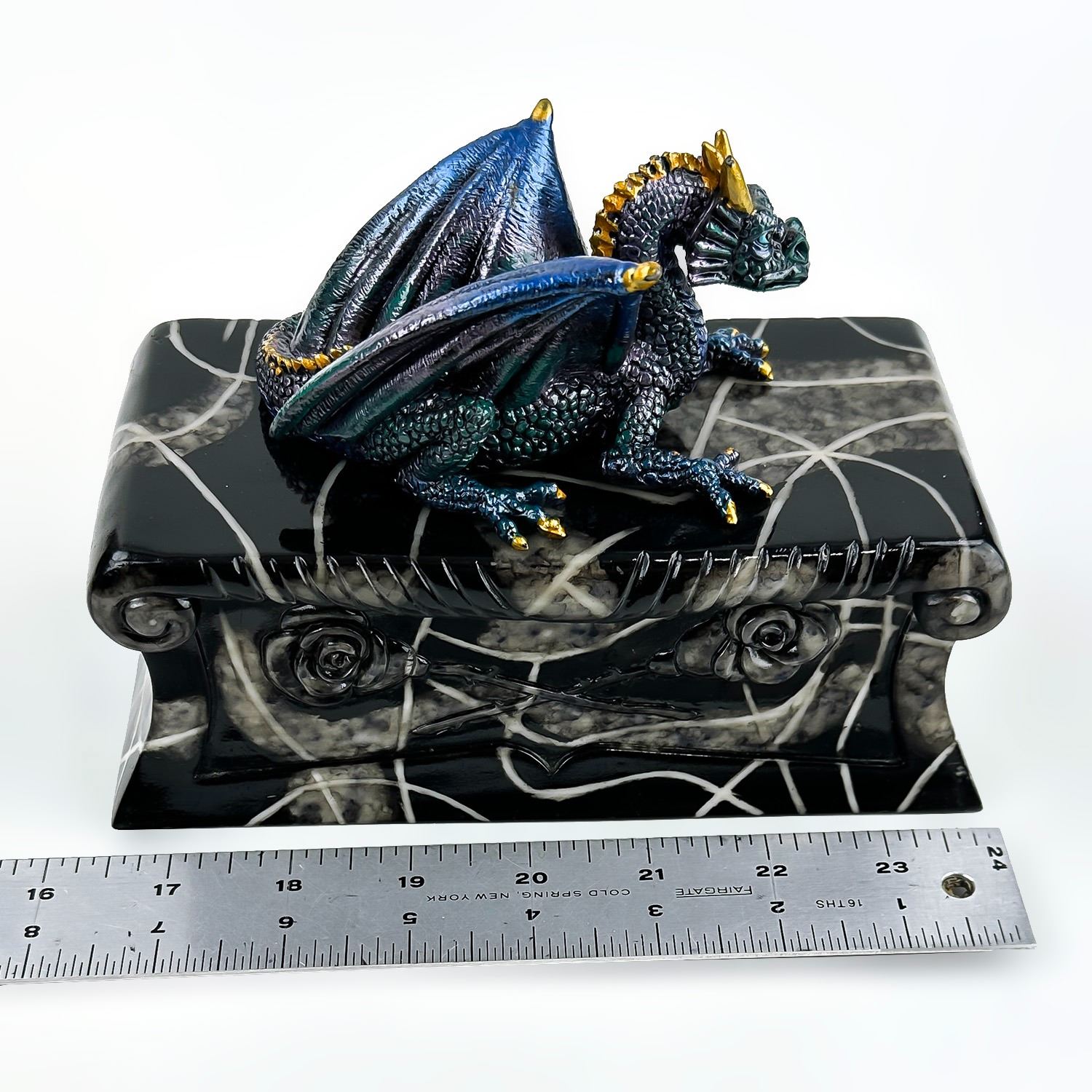 #8228 - COLLECTIBLE MULTI-COLOR BLUE DRAGON ON A COFFIN SCULPTURE. THIS LIDDED TRINKET OR JEWELRY BOX IS MADE OF A RESIN TYPE OF MATERIAL. THE DRAGON SITS UPON THE LID OF A FAUX MARBLE LOOKING BLACK ROSE COFFIN CASKET CRYPT. NO CRACKS, CHIPS OR REPAIRS. MEASURES 7.5” (19 CM) LONG BY 3.5” (9 CM) DEEP AND STANDS 5.25” (13.5 CM) HIGH - BASE TO TOP OF DRAGON HEAD.