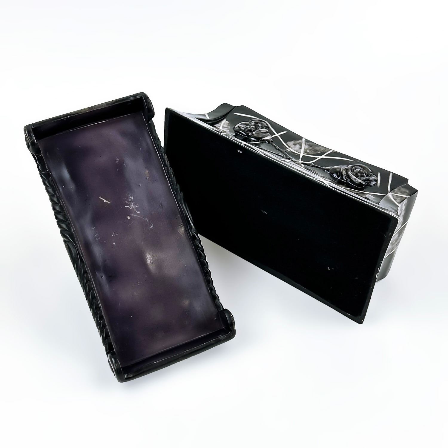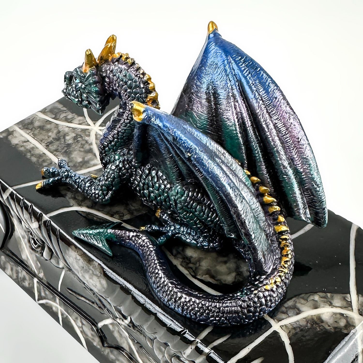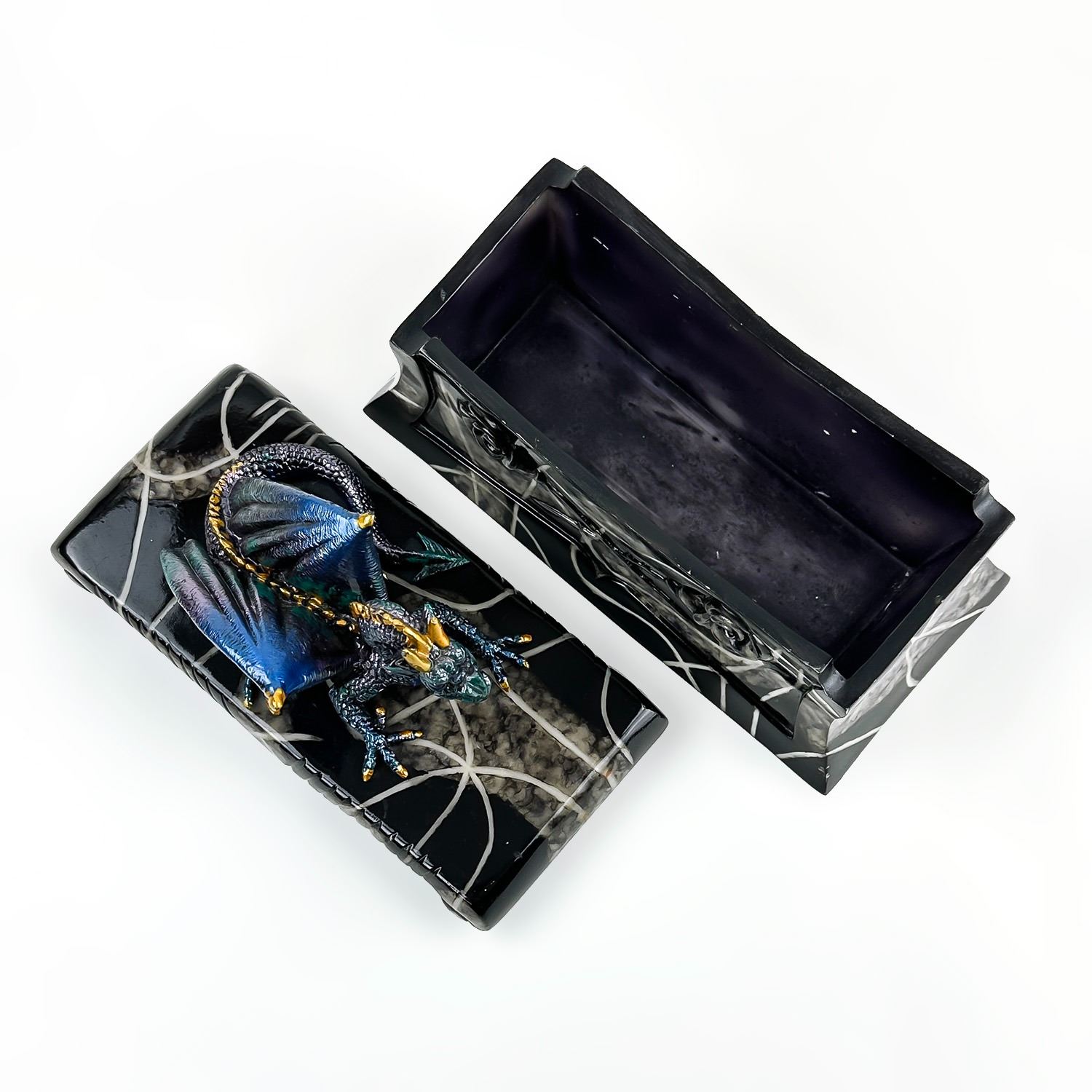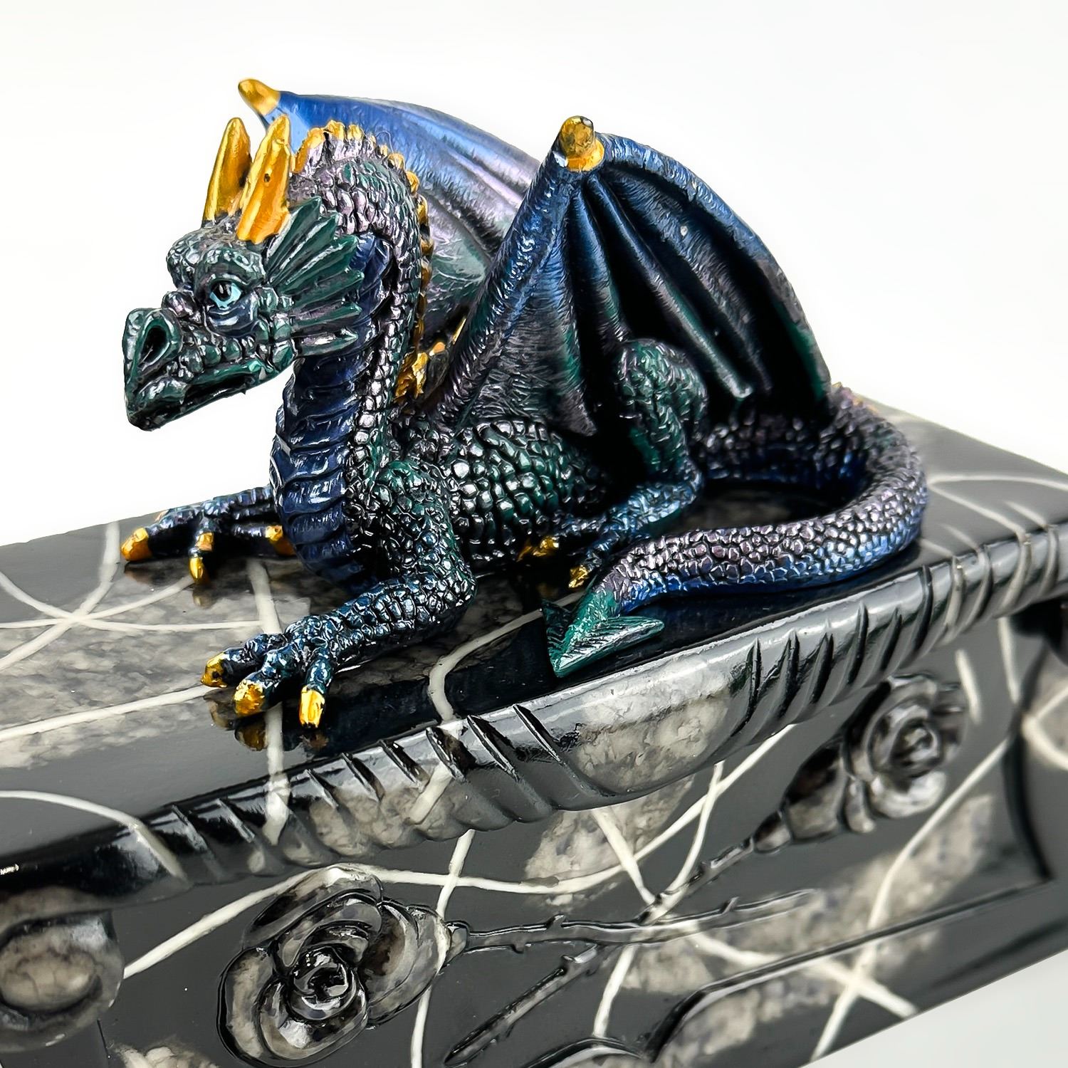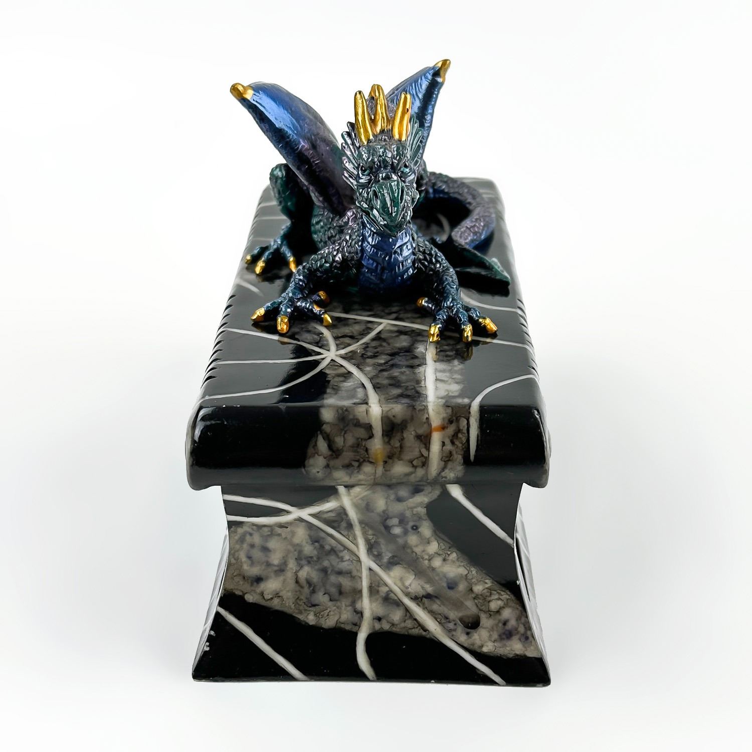 #8228 - COLLECTIBLE MULTI-COLOR BLUE DRAGON ON A COFFIN SCULPTURE. THIS LIDDED TRINKET OR JEWELRY BOX IS MADE OF A RESIN TYPE OF MATERIAL. THE DRAGON SITS UPON THE LID OF A FAUX MARBLE LOOKING BLACK ROSE COFFIN CASKET CRYPT. NO CRACKS, CHIPS OR REPAIRS. MEASURES 7.5” (19 CM) LONG BY 3.5” (9 CM) DEEP AND STANDS 5.25” (13.5 CM) HIGH - BASE TO TOP OF DRAGON HEAD.