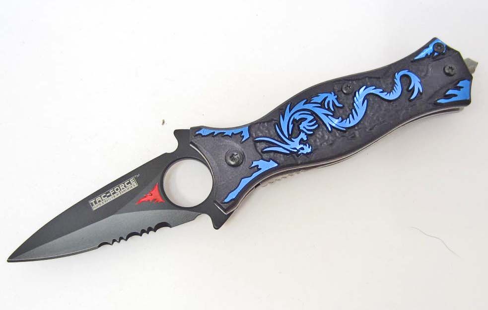 Features a black stainless steel blade with red flame. Window breaker spike on end of handle. Single edged blade with double edged look.The back (spine) of the blade has a faux edge. In-line open lock. Includes pocket / boot clip. 4-1/2" closed. TF-707BL-S