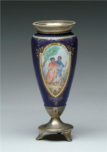 BLUE ENAMEL DECORATED VASE. A lovely French Victorian enamel bodied vase with hallmarked silver mounts. The mounts appear to be English with a rampant lion hallmark. The body is a brilliant blue with two panes. The front is decorated with a young man and lady gathering flowers and the reverse with a pair of doves and sheet music. Both panels framed in lovely white enamel beads. SIZE: 7 in. t. CONDITION: There are a couple of white enamel beads missing from one of the panels, otherwise good. 5-61499