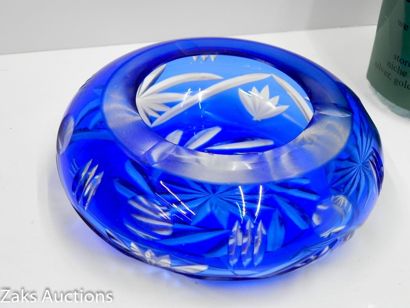 BLUE ETCHED GLASS ASHTRAY