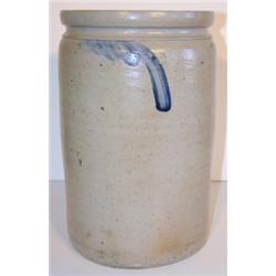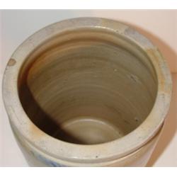 Blue feather decorated stoneware crock. Has one small chip on top rim. Overall condition is good. 12" H